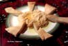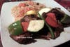 Moe recommended from among the kabob entrées, his signature “chopan kabob,” the broiled lamb riblets ($18.95). Out came a large platter overflowing with five small succulent lamb chops, grilled onion, tomato, green pepper, zucchini, rice, more homemade bread, and a piquant green chutney sauce. Though “kabobs” usually mean cubes of meat grilled and served on skewers, these wonderful riblets were grilled perfectly, and not served on skewers. We completely devoured this excellent dish, nibbling the last morsels from each rib.