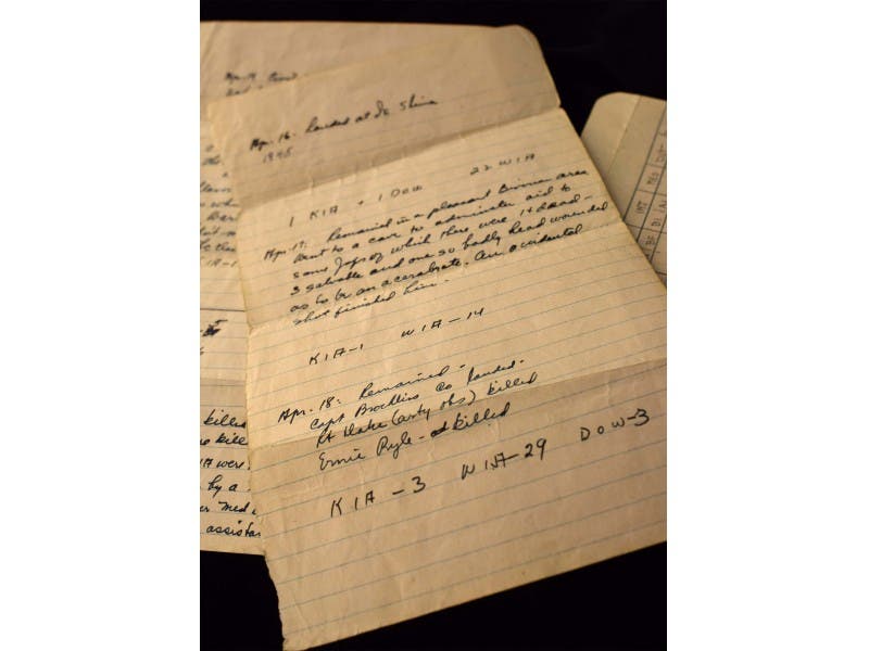 Yellowed with age, the torn pages from a journal believed to be an Army officer’s account on his men, notes their landing on Ie Shima [now Iejima] on April 16, 1945. It reflects the names of soldier’s killed in action, wounded in action and those that died of wounds. Two days later, the annotation indicated that Ernie Pyle had been killed as a result of enemy gunfire.