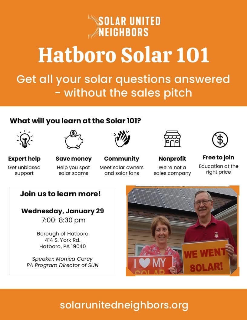 Hatboro Solar 101 features speaker Monica Carey, the state's program director of Solar United Neighbors.