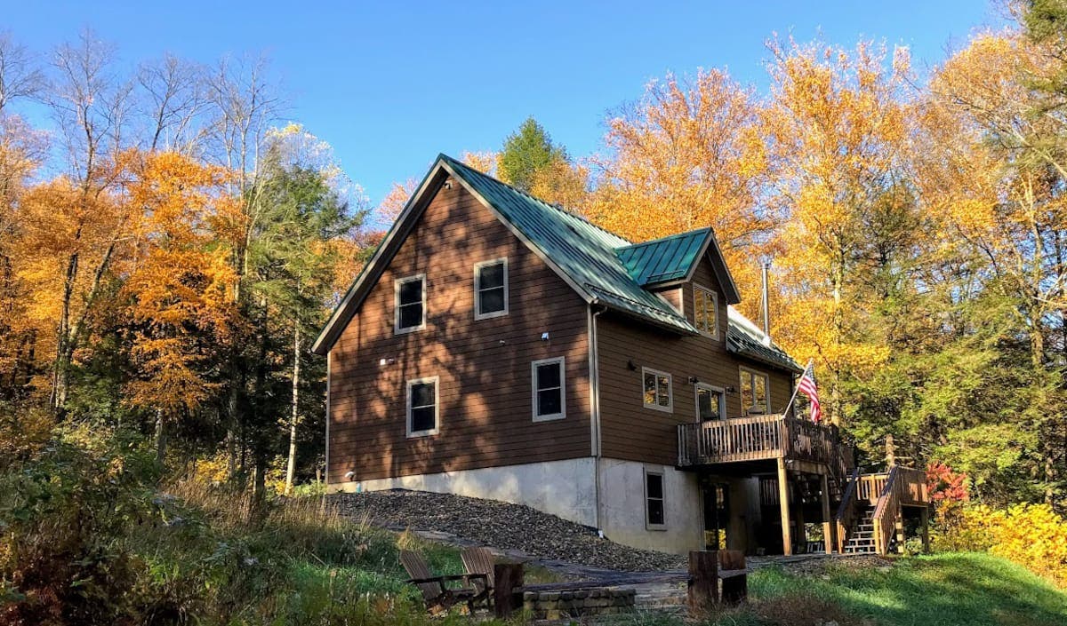 Highlights: This off-grid luxury cabin in Morrisdale is entirely powered by solar energy. It sits in a valley on the Susquehanna River, offering hiking, floating, tubing, canoeing, paddle-boarding, and more. A multi-level deck, exposed stone walls, and expansive windows highlight the spacious interior.