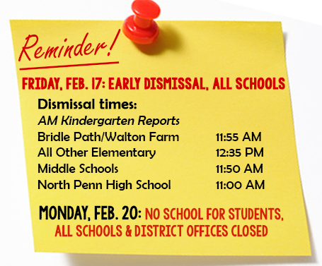 Don't forget: all North Penn schools have an early dismissal Friday, Feb. 17.