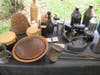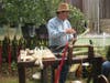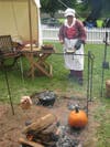 Open-pit cooking was a favorite stop for visitors as Carol Oughton was preparing a whole, stuffed chicken along with pear stew — cooking in a hollowed out pumpkin — sour dough bread and an apple pie that was baking in a Dutch oven. Curious children eagerly volunteered to keep the string wound and the chicken turning on the circa 1820 rotisserie chicken—a simple, yet efficient way to insure that the bird cooked evenly.
