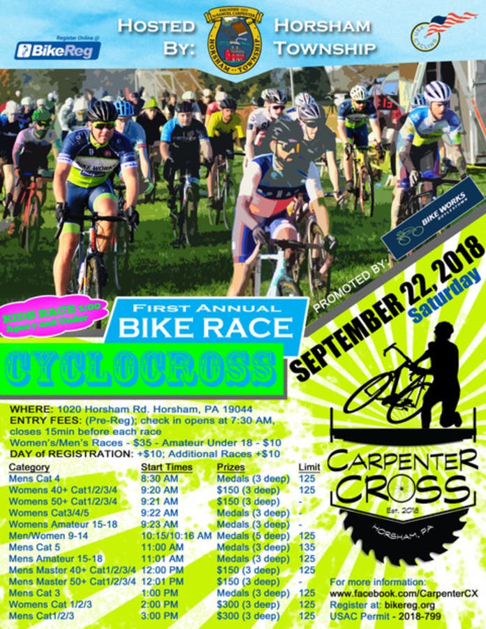 Horsham Township’s first Carpenter Cross Cyclocross race will be held rain or shine on Sept. 22 at Deep Meadow Park, 1020 Horsham Road in Horsham. Races begin at 8:30 a.m. and continue until 3 p.m. Medals, prizes and cash will be awarded. Cost is $35 for adult racers; $10 for youth ages 8 to 18; and free for kids 7 and under. To learn more or register, click here: https://www.bikereg.com/carpenter-cross.