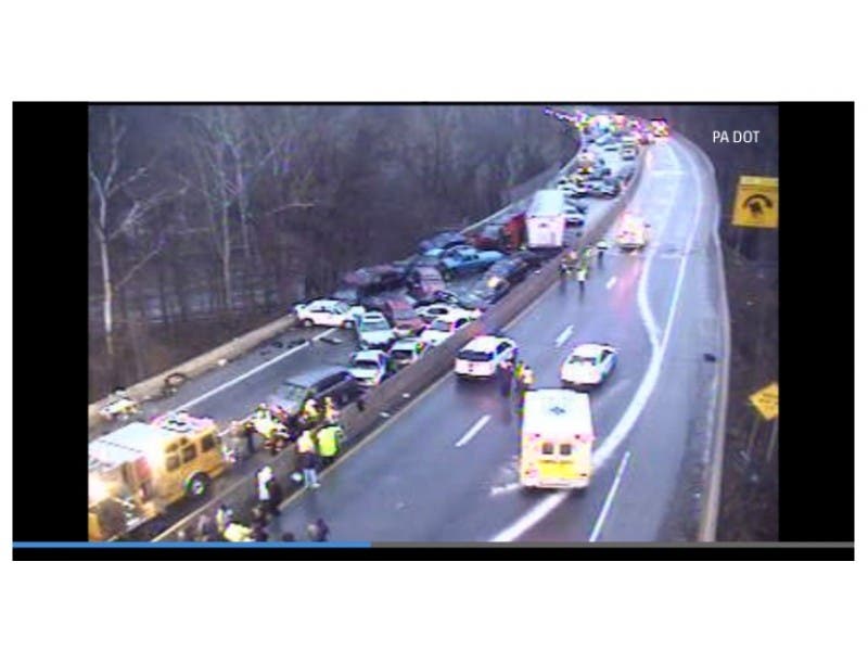 An accident involving more than two dozen cars and about 60 people were involved in a pileup that resulted in the closure of Interstate 76 in both directions in Montgomery County, according to weather.com.