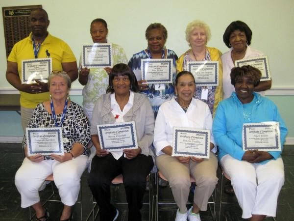 Photo Caption: Nine Montgomery County seniors completed their pre-service orientation and training recently to become the newest volunteers with Family Services’ Senior Companion Program. Pictured at the program’s graduation ceremony are (front row, left to right) Deborah Bartlett of Lansdale; Bessie Crockett of Elkins Park; Bonnie Dudley of Norristown; Joyce Elliott of Norristown; (back row, left to right) Joseph Boatright of Norristown; Hattie Fields of Hatfield; Joan Foster of Elkins Park; Mary Lou Stepsie of Spring City; and Katherine Wallace of Norristown.
