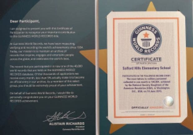 Towamencin DAR Regent Holly Hayick, Treasurer Diane Hustead, Recording Secretary Sara Natali and member Pam Martino presented the students and faculty of Salford Hills Elementary School with a Guinness World Record Certificate to thank them for helping the DAR set a Guinness World Record of writing more letters to American soldiers in one month than anyone else had done before.