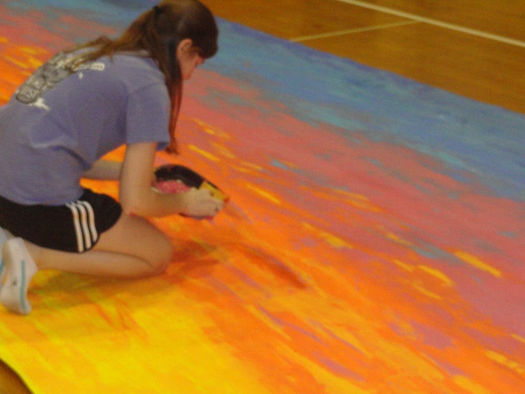Every Tuesday, Thursday (and as prom nears, Saturday) the East Gym and hallways bustle with kids bringing landscapes and fantasies alive on paper murals, refilling paint, and excitedly discussing the details leading up to May 19.