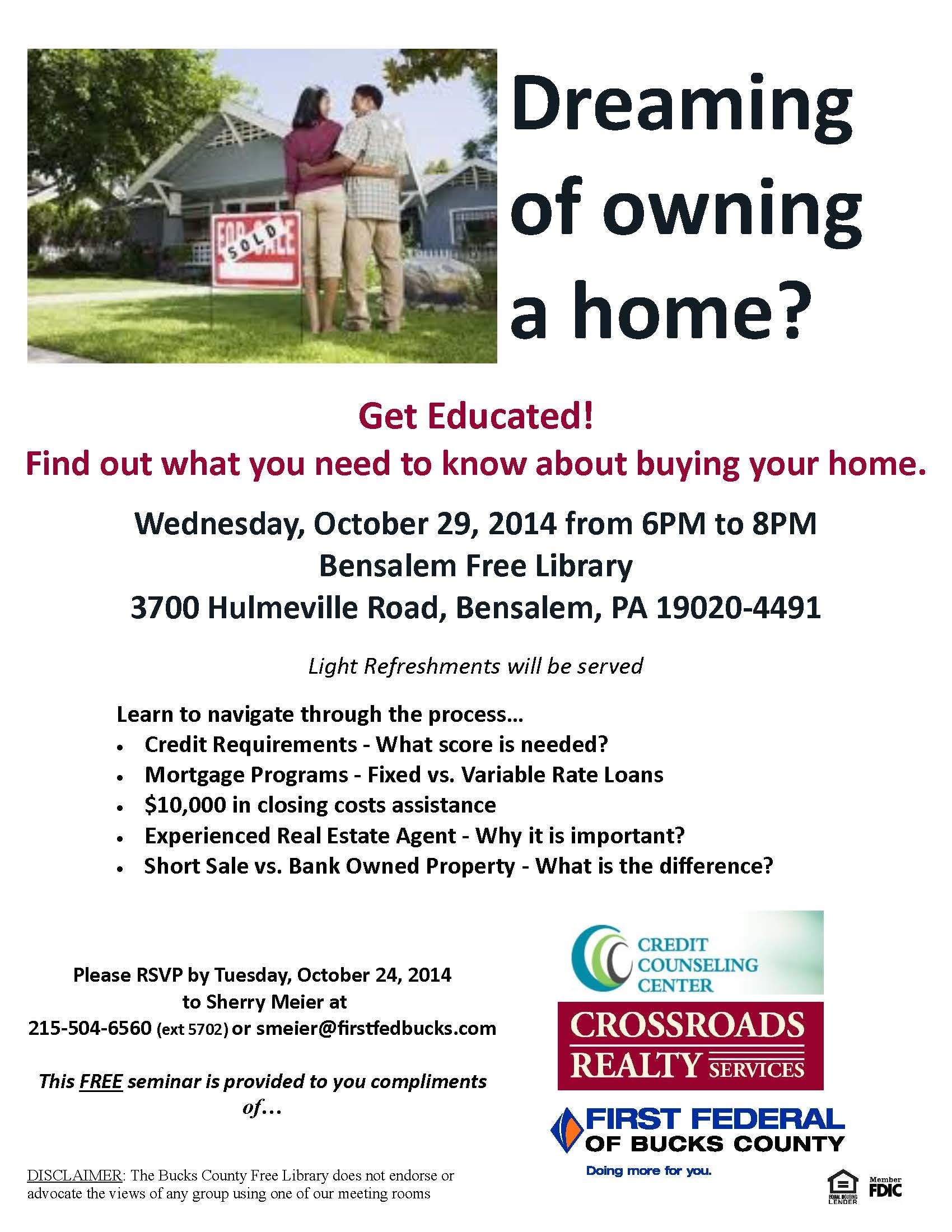 Details: Prospective homebuyers can get help from the pros at a free seminar that is open to the public and will be held at the Bensalem Free Library. Attendees will learn how to navigate the process of credit requirements, various mortgage programs, the differences between short sale and bank-owned properties, the importance of using an experienced real estate agent and various other home buying topics. Light refreshments will be served. The program is co-sponsored by First Federal of Bucks County, Credit Counseling Center and Crossroads Reality Services.