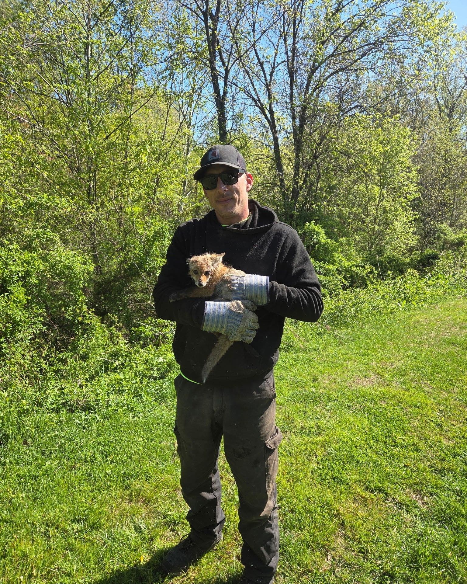 Public works employees Joe Judge and Dave Kabana were at Delaware Canal Park near the Wawa on Route 1 cutting up a damaged tree when they spotted the fox in distress.