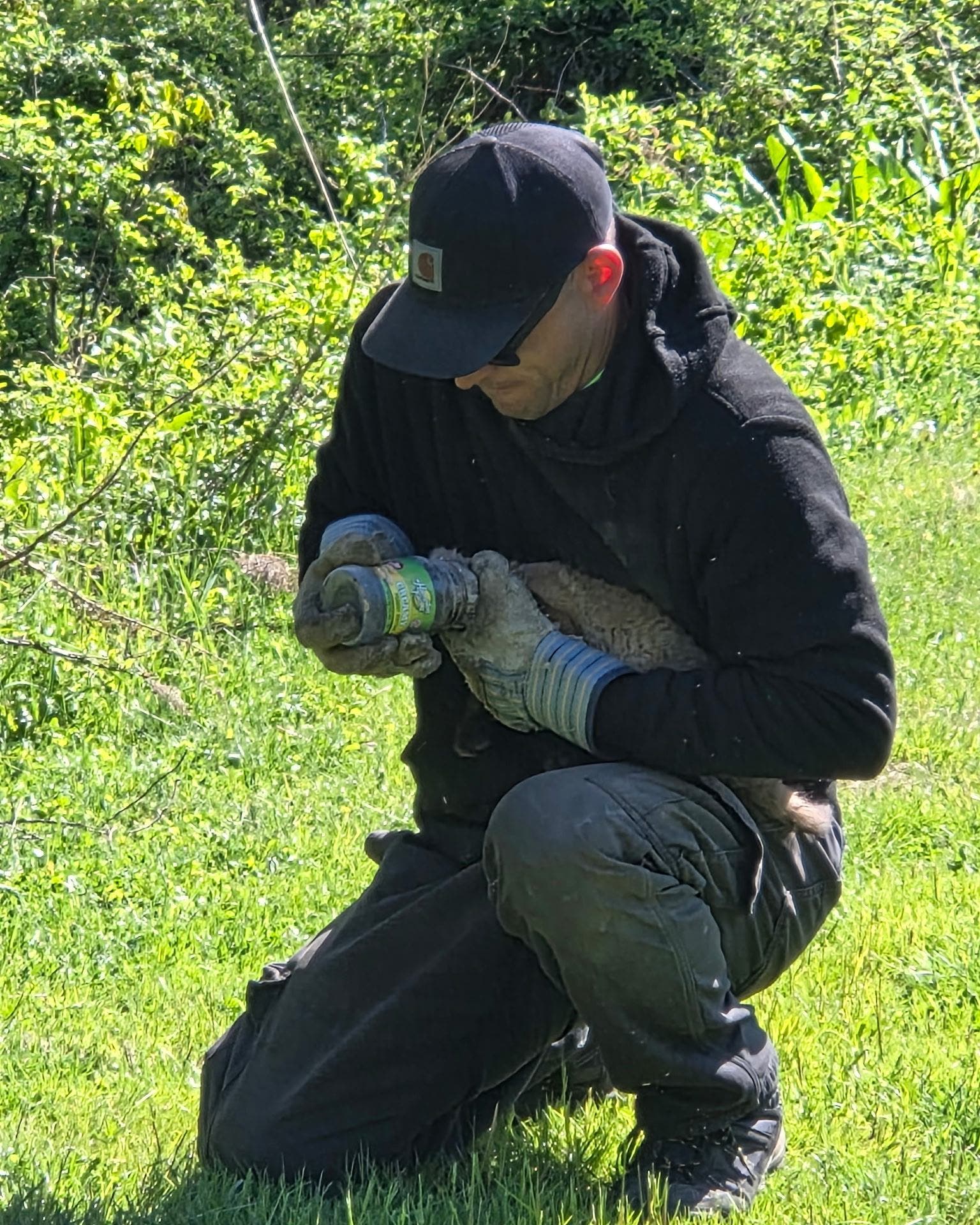 Public Works employee Joe Judge helps free a jar from a fox's head on Tuesday morning.