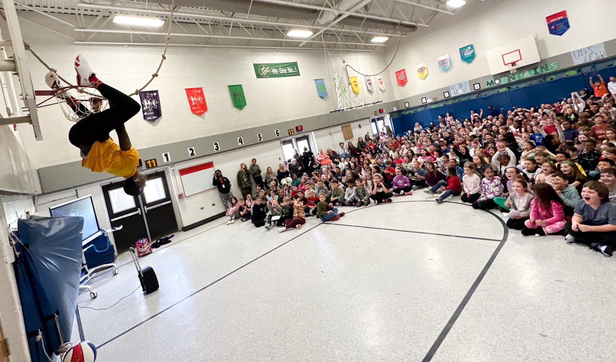 Brown visited the Tawanka, Ferderbar, and Hoover elementary schools and Buck, Miller, and Schweitzer schools for assemblies the day before to show his basketball skills and tricks before masses of students who yelped and joined in on the fun.