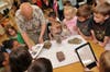 First grade students get hands-on look at dinosaur fossils.