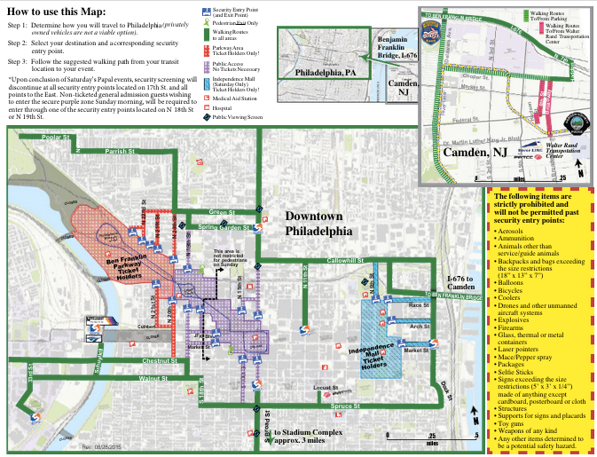 A map released this week by the Secret Service shows two “Secure zones,” which will be surrounded by security checkpoints. The Pope’s speech on Independence Hall, scheduled for 4:45 p.m. on Saturday, Sept. 26 will be for ticket holders only. A secure zone will be set up in that area.