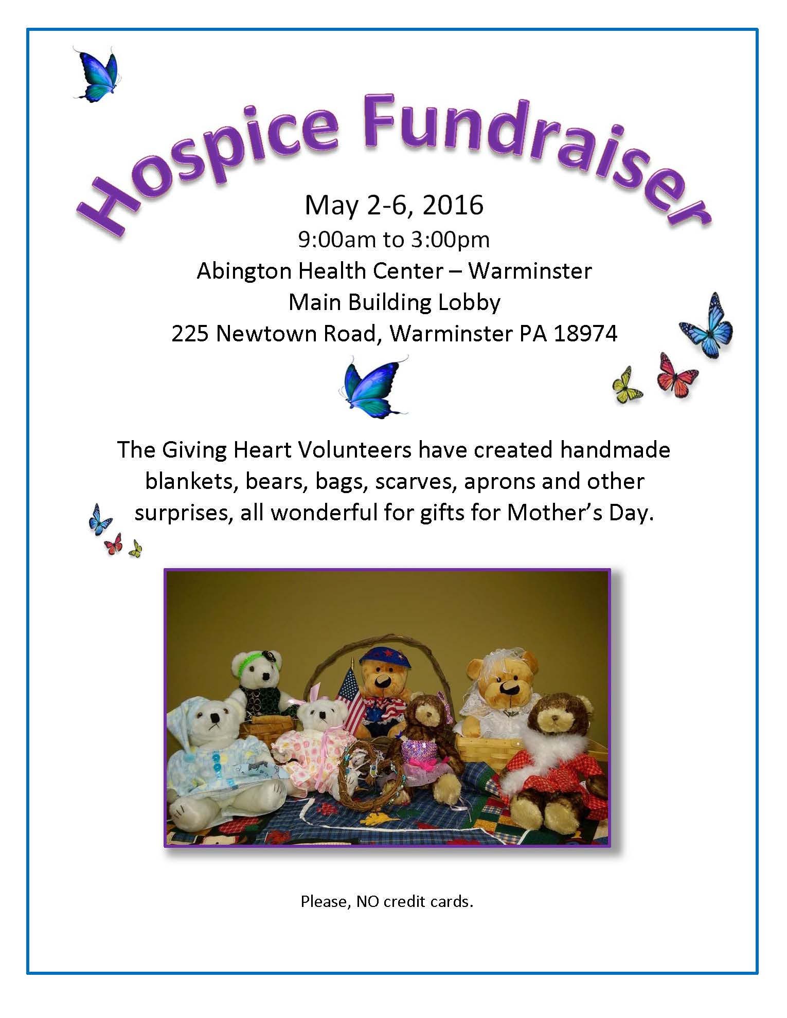 Come see the beautiful crafting to find your own Giving Heart to support the Abington Warminster Hospice unit. Bring 50 of your closest friends--there will be plenty of gifts perfect for Mother's Day.