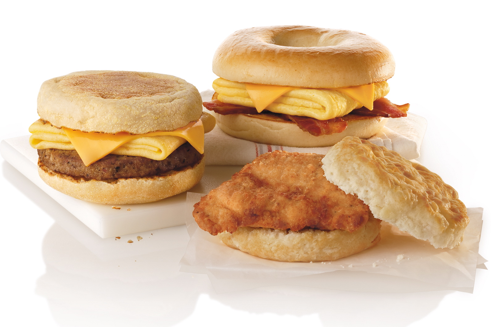 - Bacon, Egg & Cheese Bagel: Strips of smoked Applewood bacon, folded egg and cheese served on a toasted bagel. Starting at $2.95.