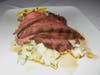 Creekstone Farm Hanger Steak ($26) was cooked to order, and served sliced and fanned over potato chunks with the texture of mashed potatoes. Lemony tart julienne of yellow squash decorated the top of the red-pink meat. The steak was a generous portion of tender meat that reminded us of chu toro (tuna belly) with the richness of the marbled fat melting in the mouth like butter.