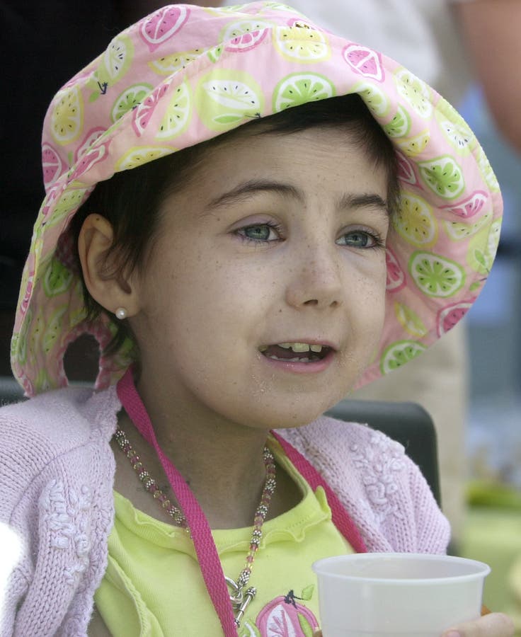 Alexandra Scott, diagnosed at age one with an aggressive form of childhood cancer called neuroblastoma, sits at her lemonade stand selling drinks at Penn Wynne elementary school in Wynnewood, Pa. Saturday June 12, 2004. Driven by heart-lifting determination, eight-year-old Alex is holding her fifth-annual "Alex's Lemonade Stand" Saturday in hopes of raising $1 million, a goal within reach thanks to the hundreds of stands planned in all 50 states. Alexandra died on Aug. 1, 2004. She was 8. (AP Photo/Jacqueline Larma)