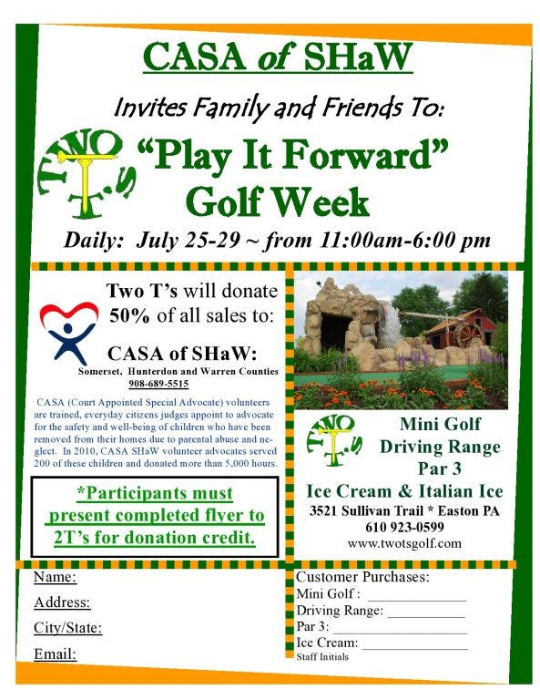 Please be sure to bring a printed flyer with you inorder for CASA to recieve donation credit from Two T's. Print off your flyer today by clicking the link below. http://www.casashaw.org/EventsandFundraisers.aspx