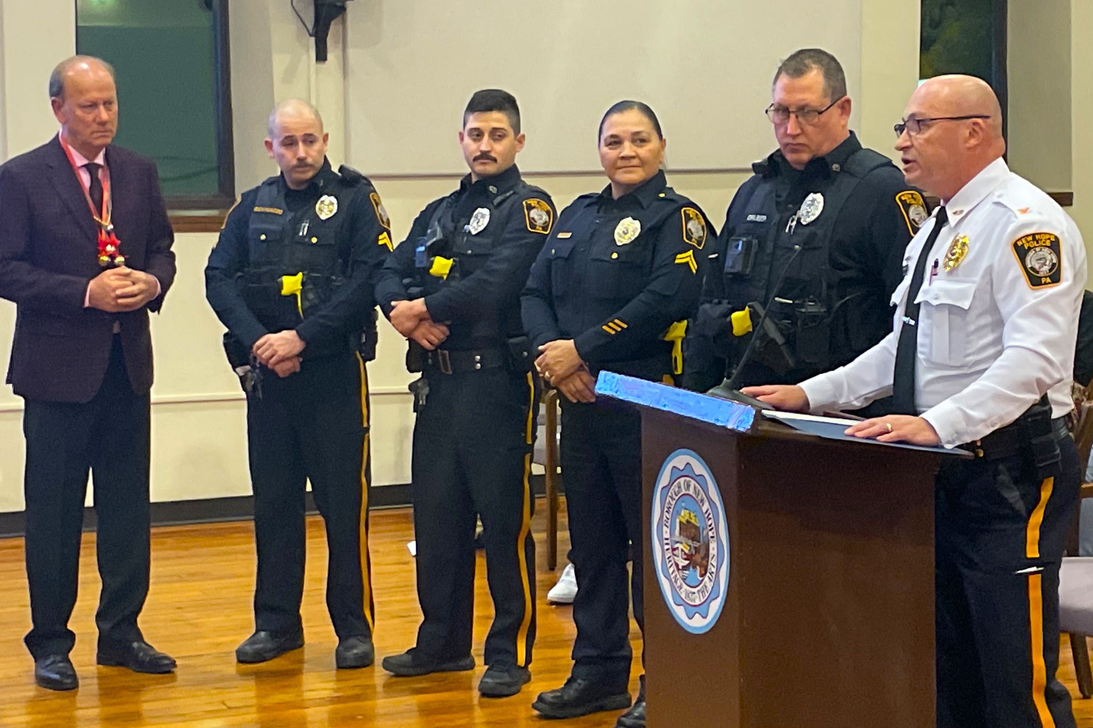 Chief Kevin Edwards joined Mayor Larry Keller to publicly recognize the officers for their response to two incidents in the borough.