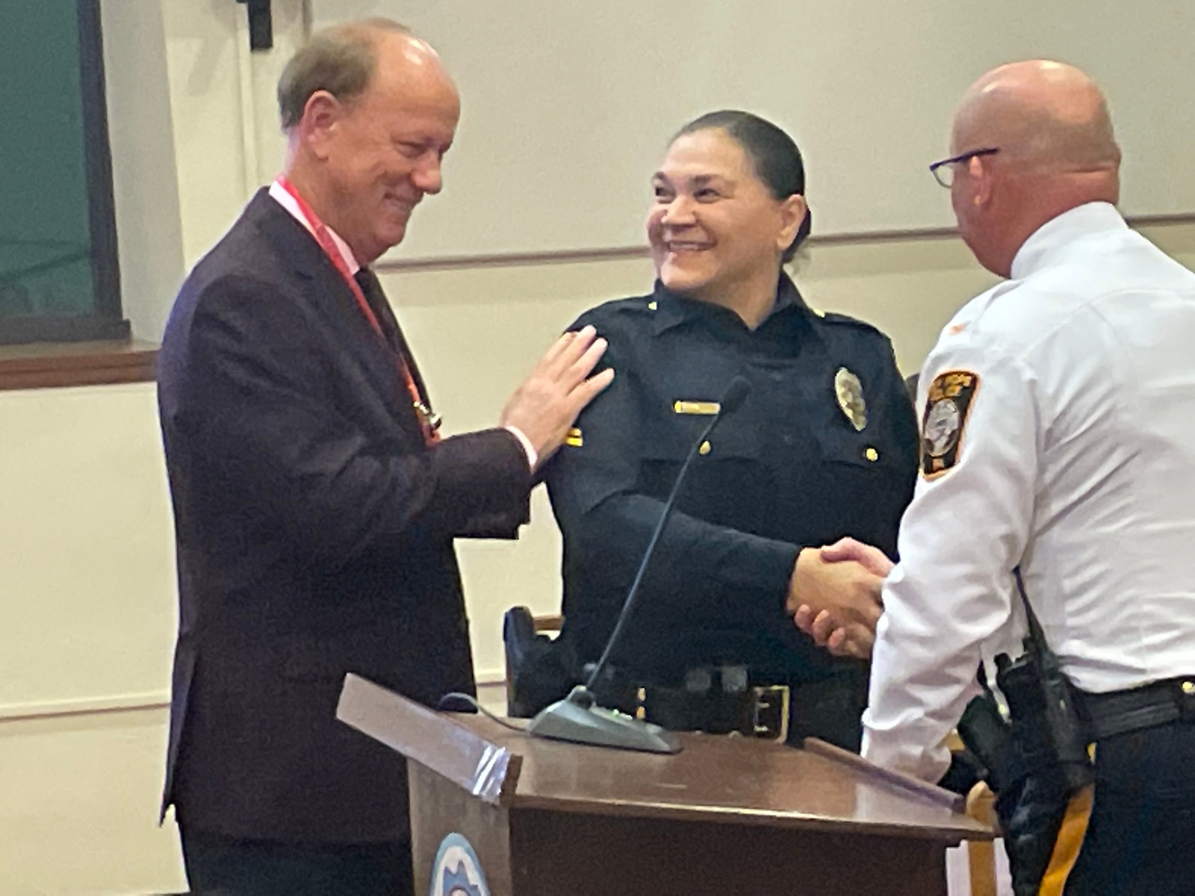 Cpl. Dawn Haas is thanked for her 20 years of service with the department by Mayor Larry Keller and Police Chief Kevin Edwards.