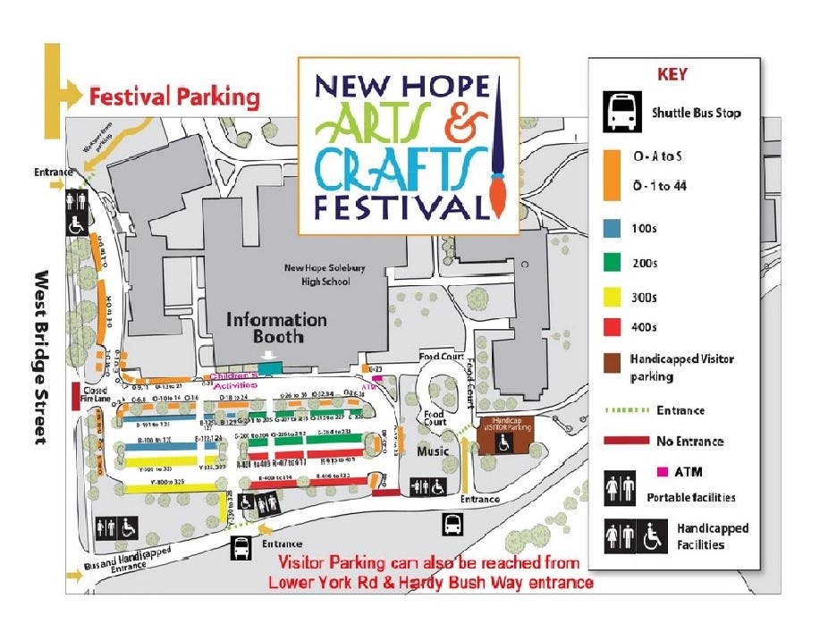 The festival takes place at the New Hope–Solebury High School parking lot, just a few minutes walk from the center of the business district, and there is a free bus to from the festival parking to South Main Street at the Bucks County Playhouse.