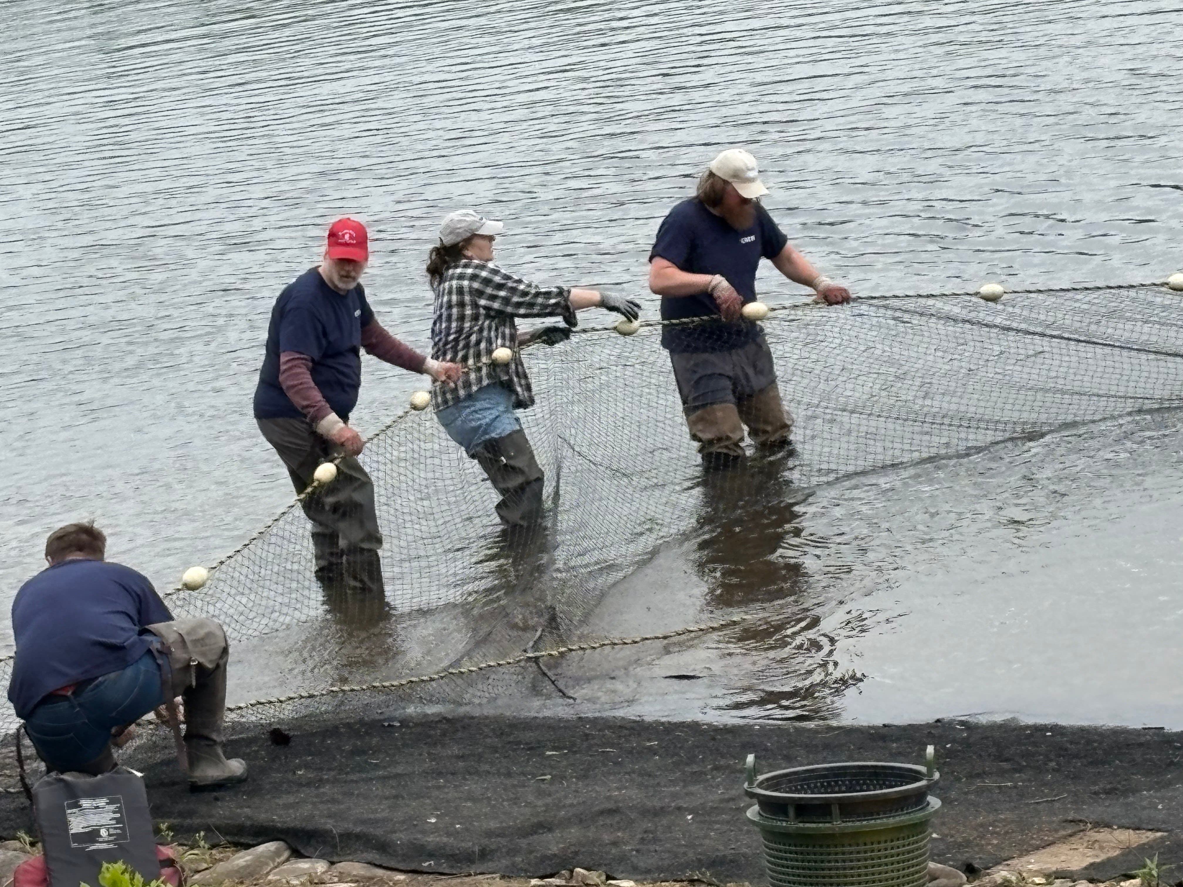 A few rain showers failed to dampen Saturday’s fishing demonstration at Lewis Island, where members of the fishery hauled in a catch of catfish, but turned up no shad. Earlier that morning, they caught seven, which they showed to the gathering.