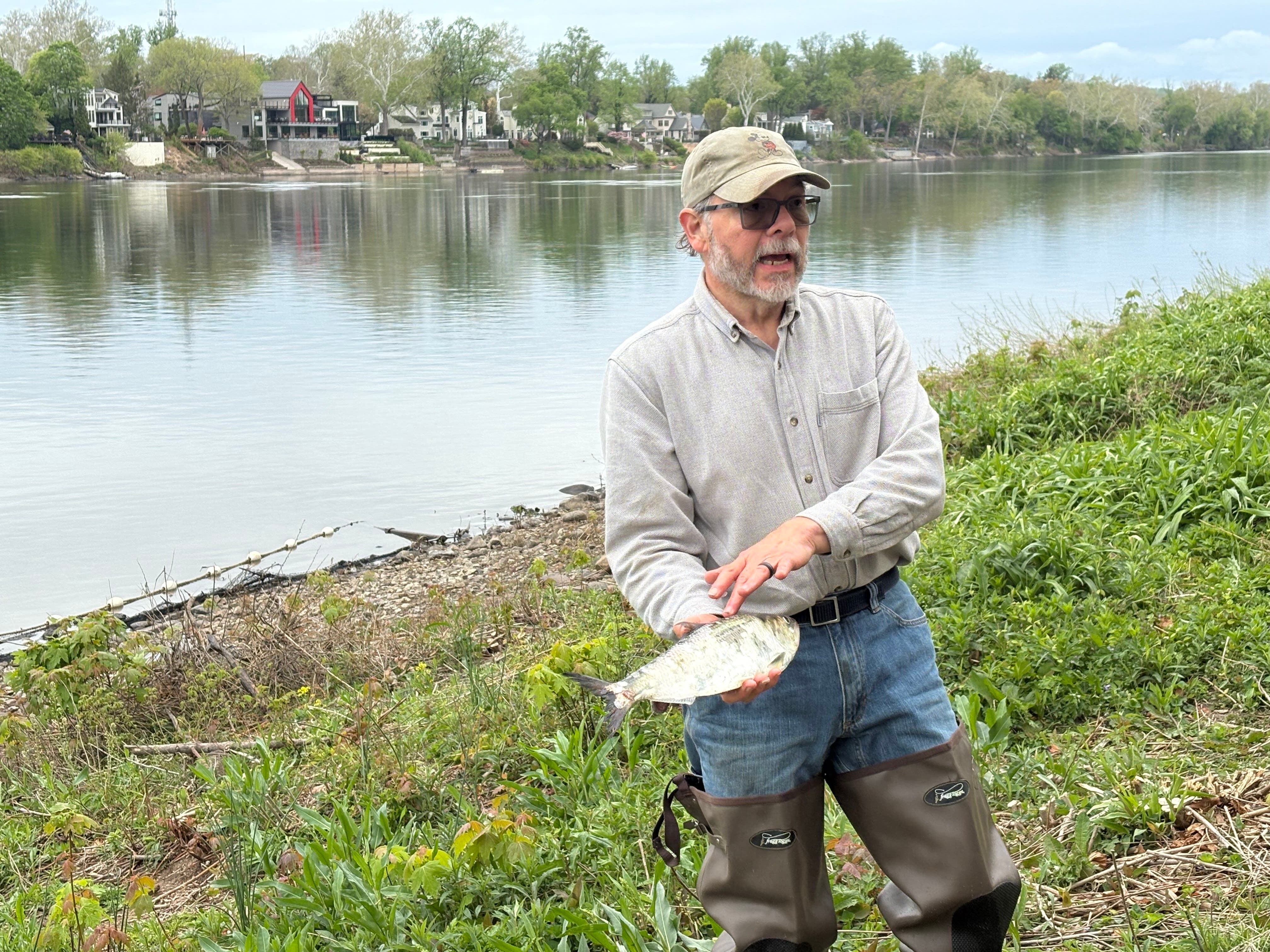 Steve Meserve shows off a shad caught during the morning haul. (Jeff Werner/Patch)
