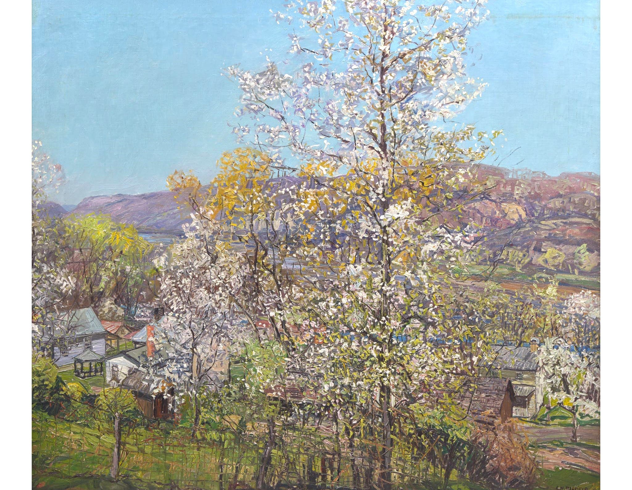 Among the works on view will be Edward Redfield's impressively-scaled "Spring Veil," which depicts the artist's beloved Delaware River Valley seen from Point Pleasant; A Glorious Day, a large canvas by the ever-so-rare Morgan Colt who lived at Phillips' Mill; as well as Daniel Garber's freshly discovered On the Delaware River from the 1930s.