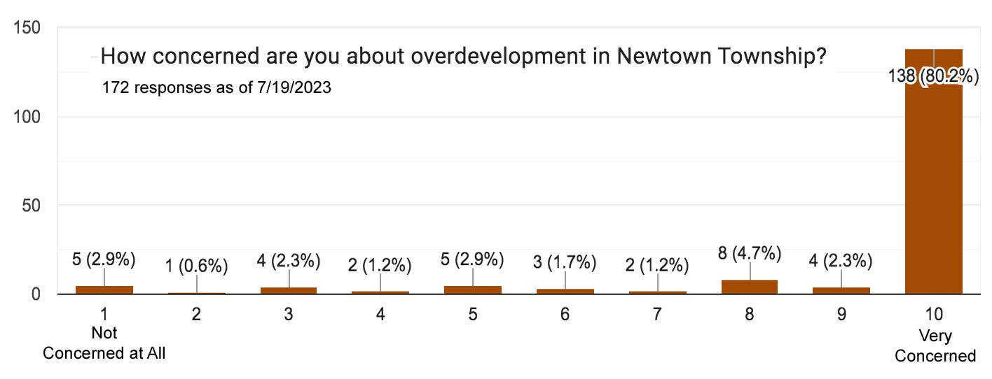 How concerned are residents about overdevelopment in Newtown Township? To answer that question, I started a short survey, which has received 172 responses (including 129 responses from Newtown Township residents) and over 120 comments, as of July 19, 2023. Over 80% of all respondents and 79% of Newtown Township residents are “Very Concerned” about overdevelopment in Newtown Township.