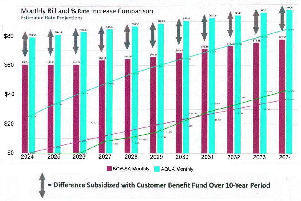 The audio clip begins with John Cordisco, BCWSA Board Chair, giving an overview of the purchase agreement under consideration. He specifically discussed some details of a “rate stabilization plan” (aka “Customer Benefit Fund”) designed to shield customers from anticipated increased rates should the deal go through. “We will NOT move forward,” said Cordisco, “unless there is at least a 10-year rate stabilization.”