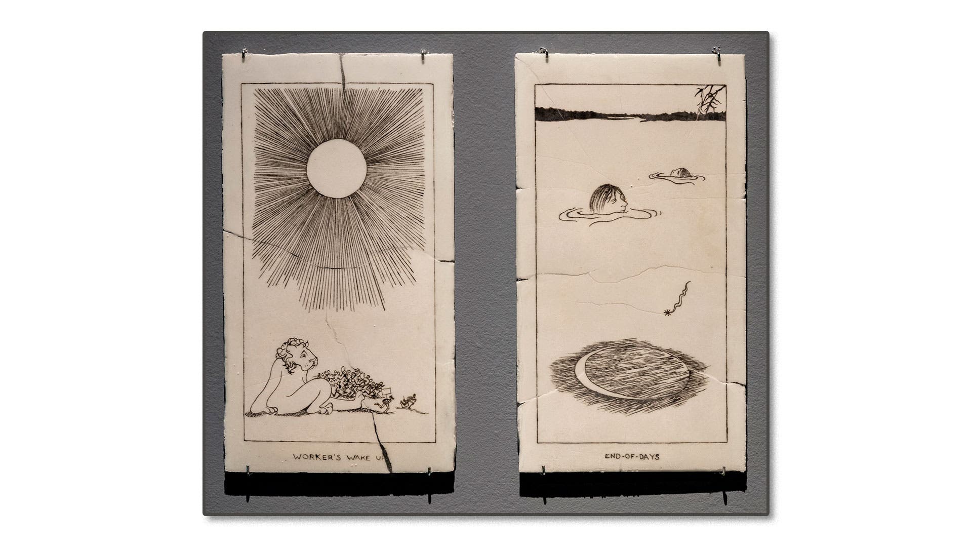 “End-of-Days and Workers Wake Up” installation view