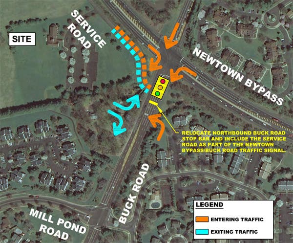 Alternative 2 – Signal Relocation Access: This option involves signalizing the Service Road intersection with Buck Road (S.R. 0532) as integrated with the traffic signal at the Newtown Bypass (S.R. 0332)/Buck Road (S.R. 0532) intersection, and as part of this option, the northbound Buck Road (S.R. 0532) stop bar will be moved to the south side of the Service Road intersection.