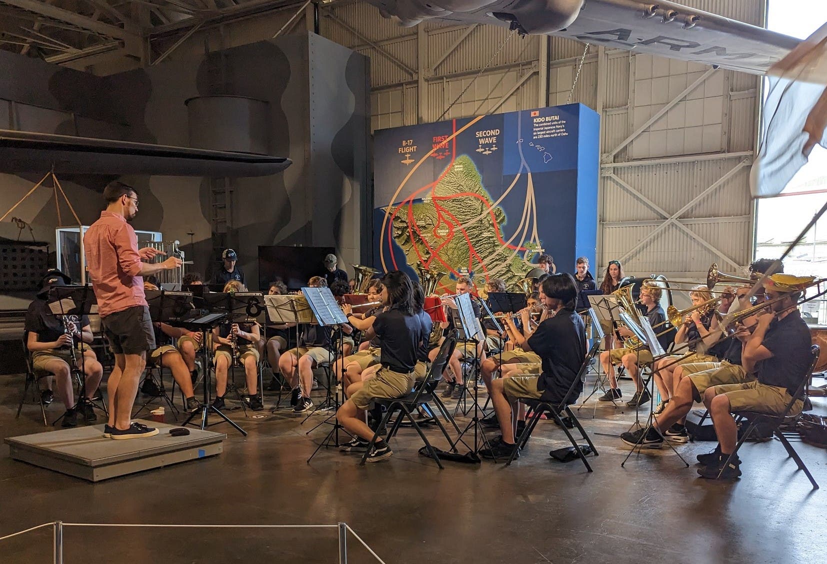 Performing at the Pearl Harbor Aviation Museum. (photo by Council Rock North Band)