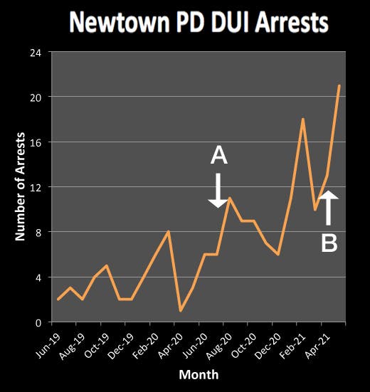 NOTE: In April and May 2020, the Newtown Police made fewer patrols to protect the force from infection. Consequently, the number of DUI arrests for those months are perhaps lower than usual.