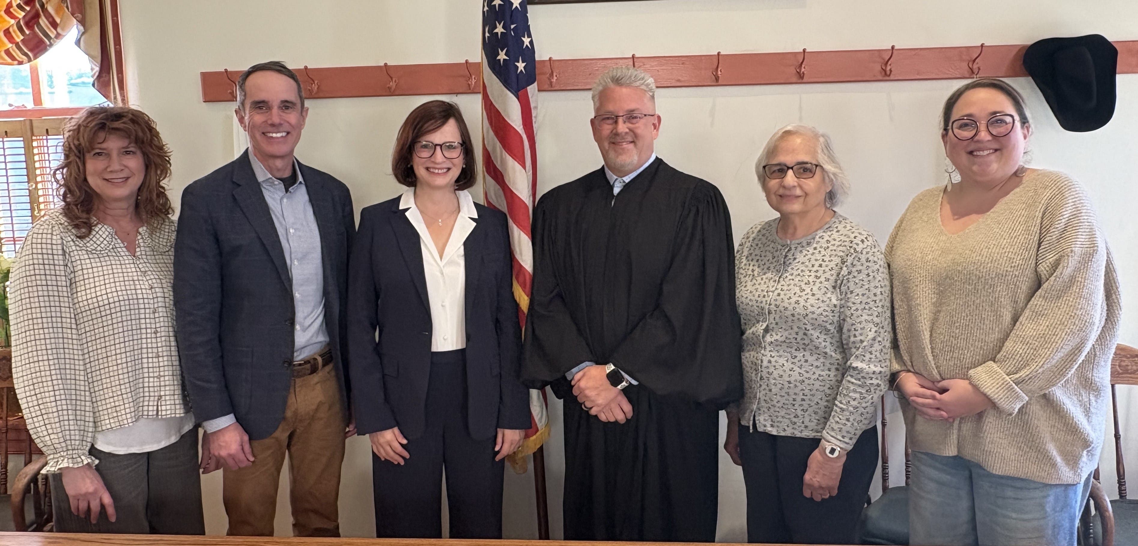 In attendance at the historic swearing-in ceremony are, from left, council vice president Gina Tognini, State Senator Steve Santarsiero, Mayor Tara Grunde-McLaughlin, Judge Petrucci, councilor Julia Woldorf, and council president Emily Heinz. (Jeff Werner/Patch)