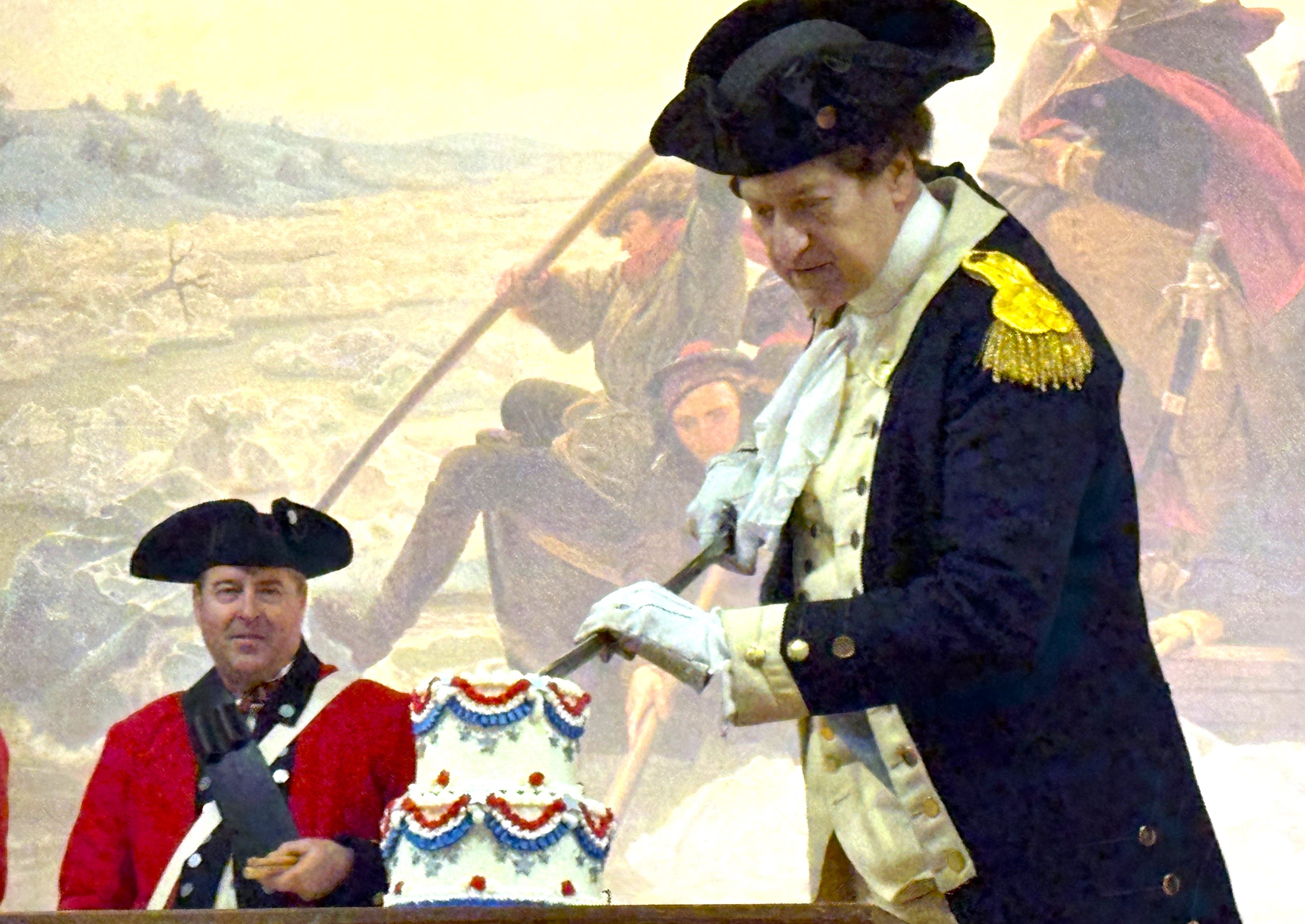 As smartphones rolled and wide-eyed children watched, Washington, dressed in his striking blue and gold uniform, used a three-foot-long sword to slice through his red, white and blue birthday cake provided by the Caketeria in Newtown.
