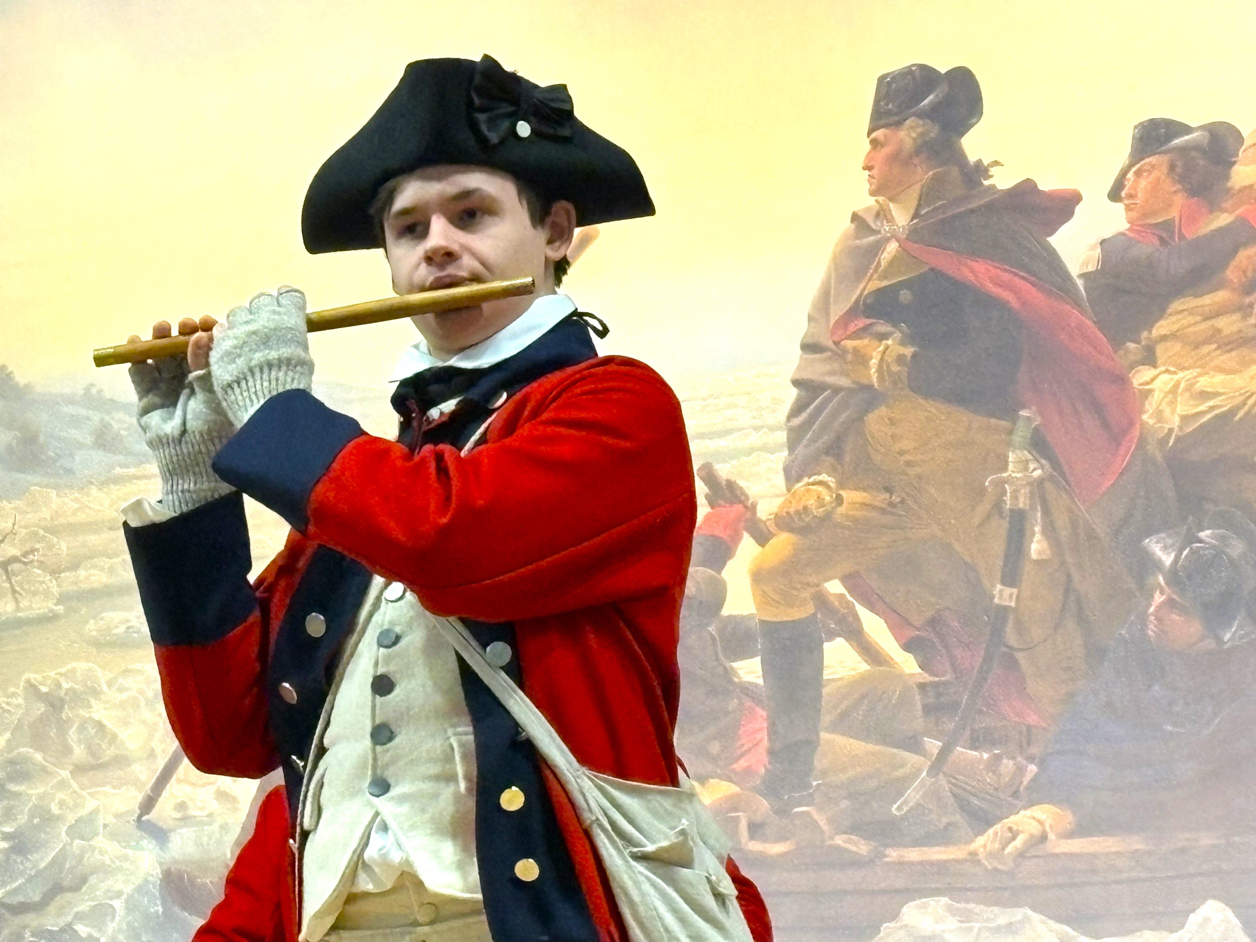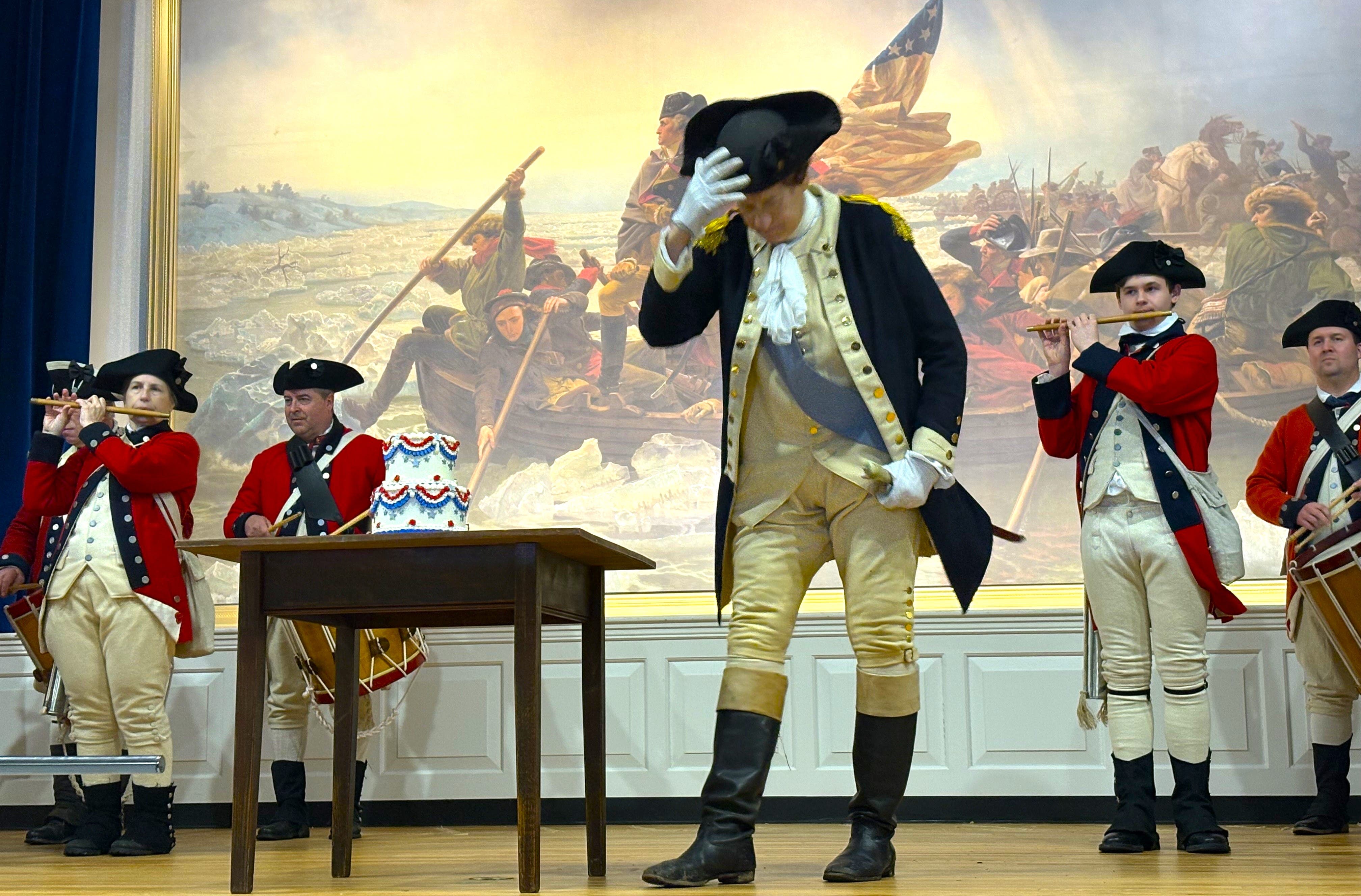 As Washington walked onto the stage inside the center's auditorium and before a painting by Emanuel Leutze of his famous crossing, the park's Fifes and Drums performed the "Coronation March," which was played in his honor as he marched through Trenton on his way to New York to become President of the United States in 1789.