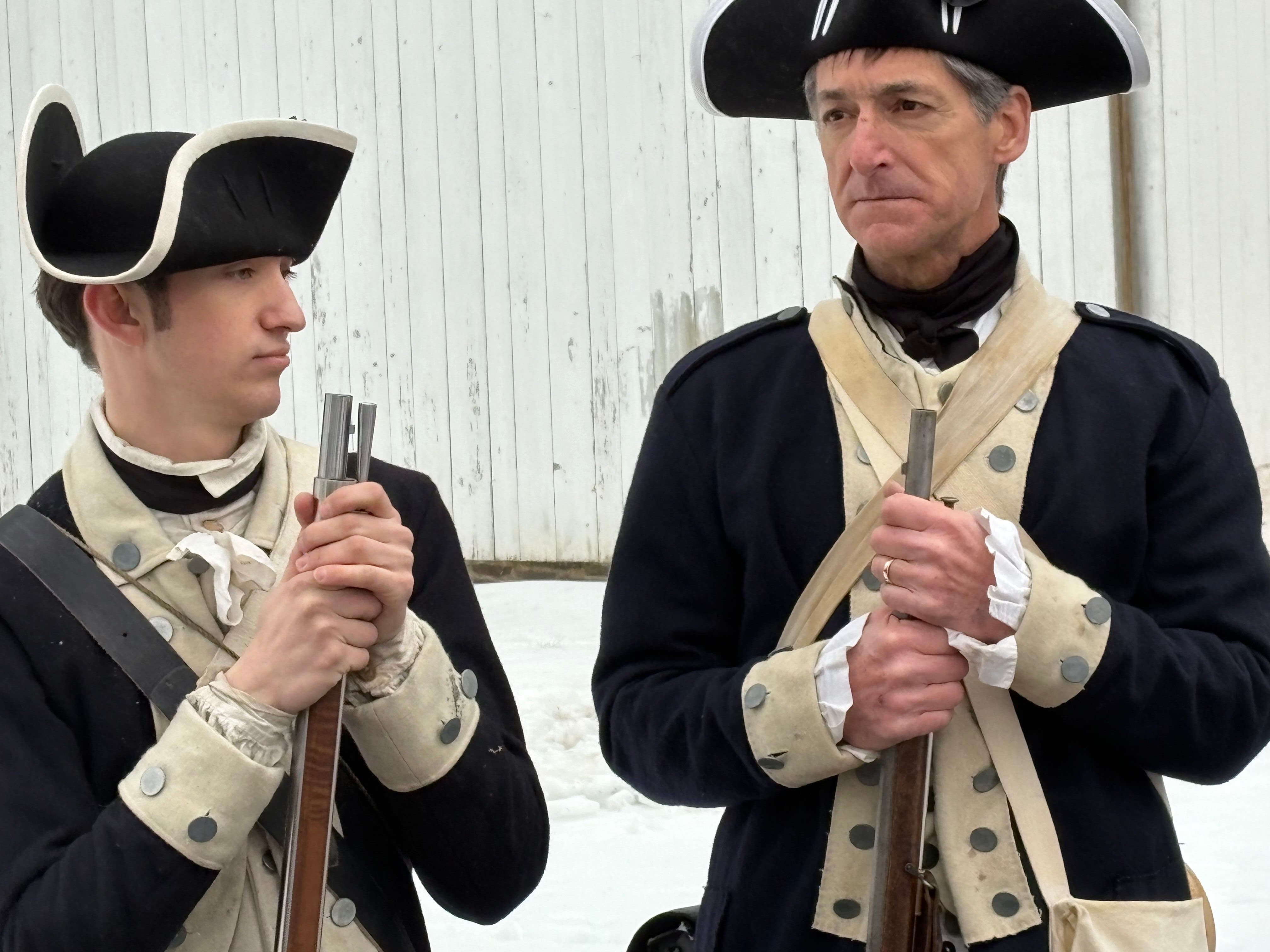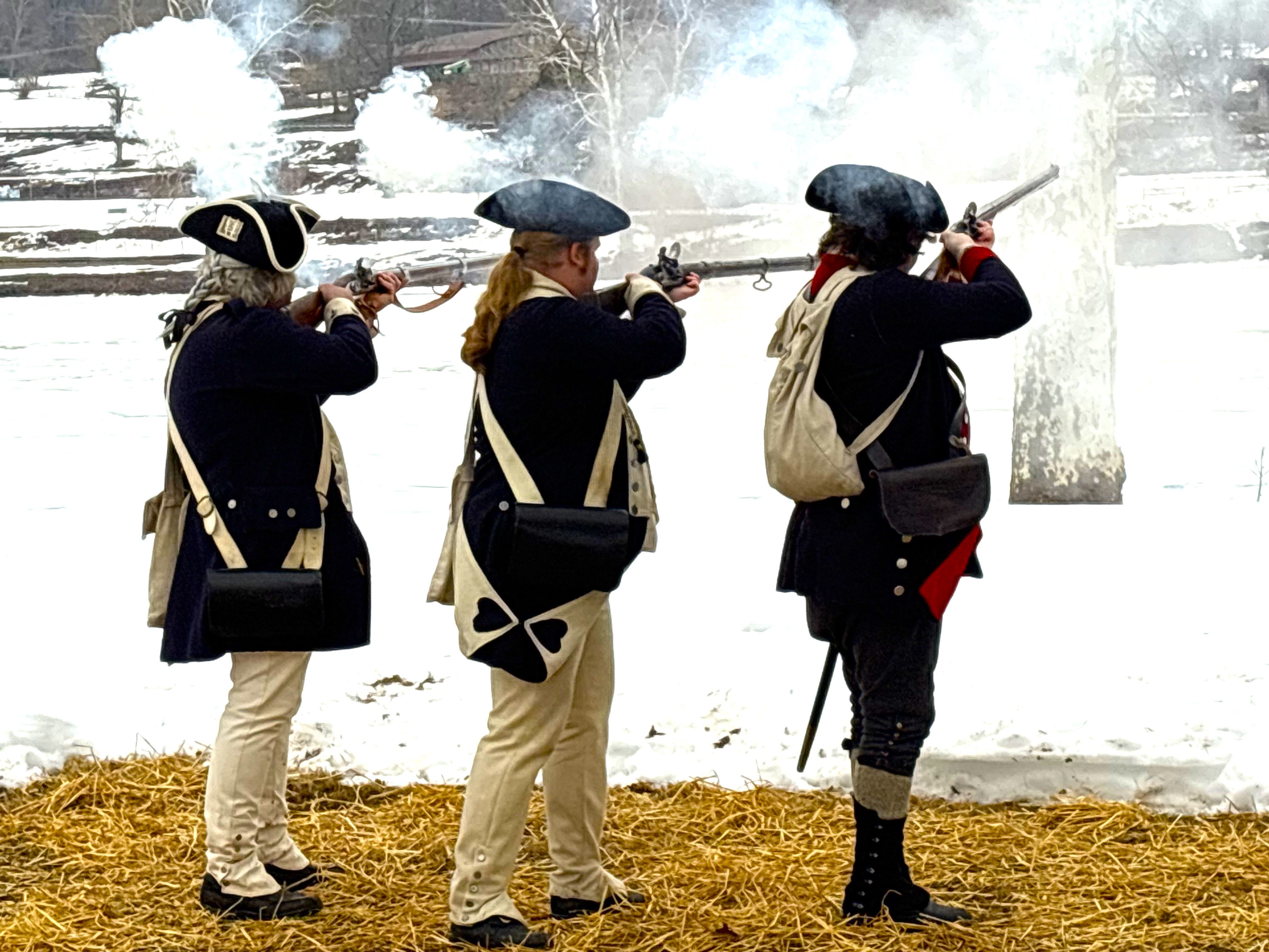 A musket firing demonstration on the banks of an ice-filled Delaware River. (Jeff Werner/Patch)