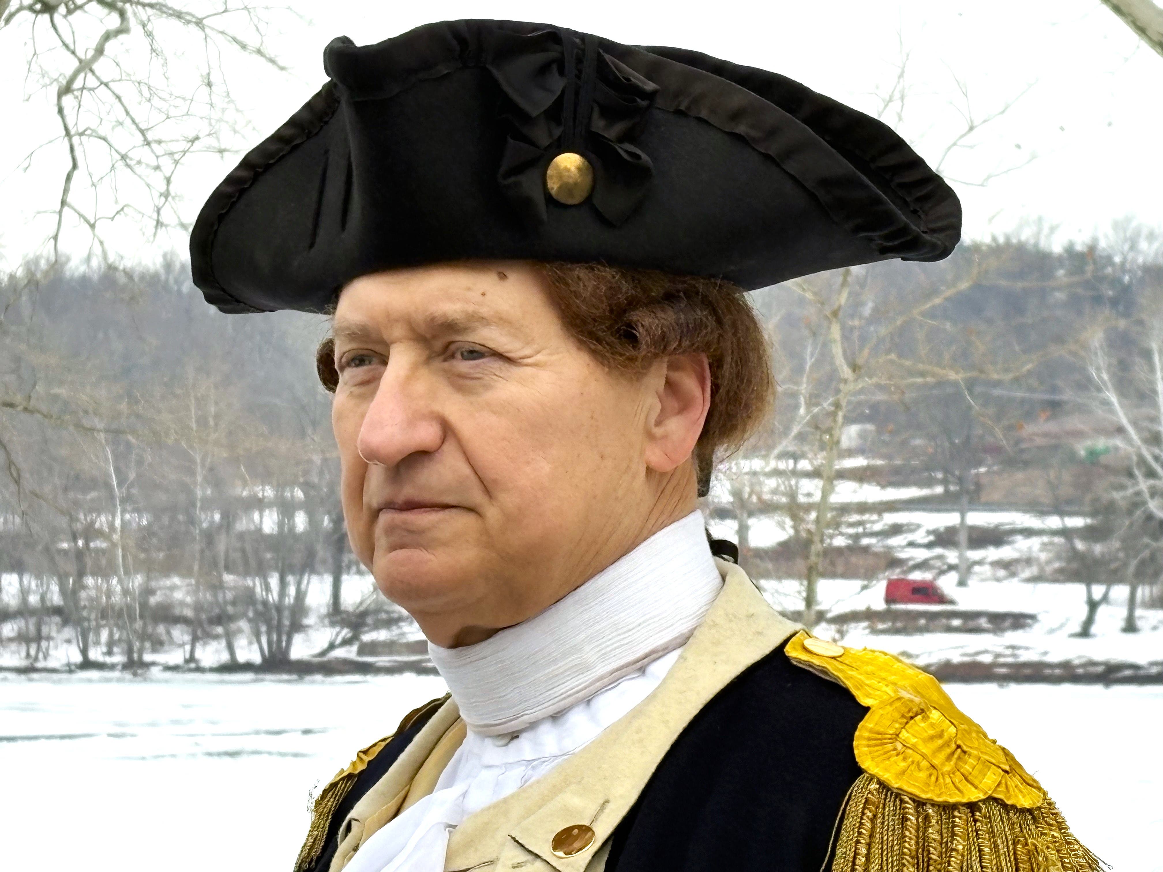 General Washington, portrayed by John Godzieba, on the banks of the ice-filled Delaware River. (Jeff Werner/Patch)