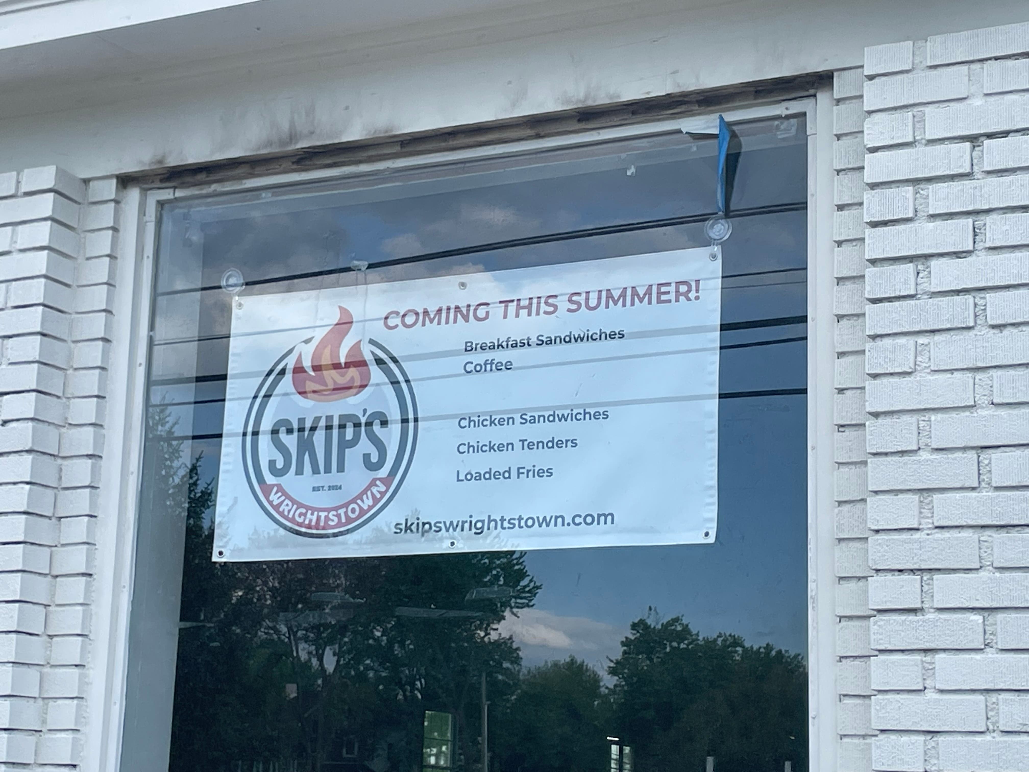A sign in the window announces that "Skip's Wrightstown" is coming this summer.