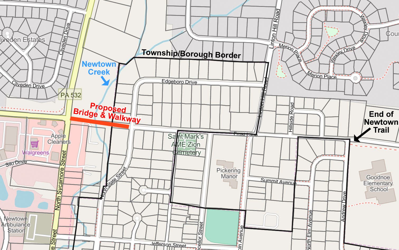 There is a small wooden pedestrian bridge a few hundred feet south of Frost Lane where North State Street turns into Edgeboro Drive. That bridge is currently closed for safety reasons. The bridge is privately owned by 2 separate private property owners, not Newtown Township or Newtown Borough.