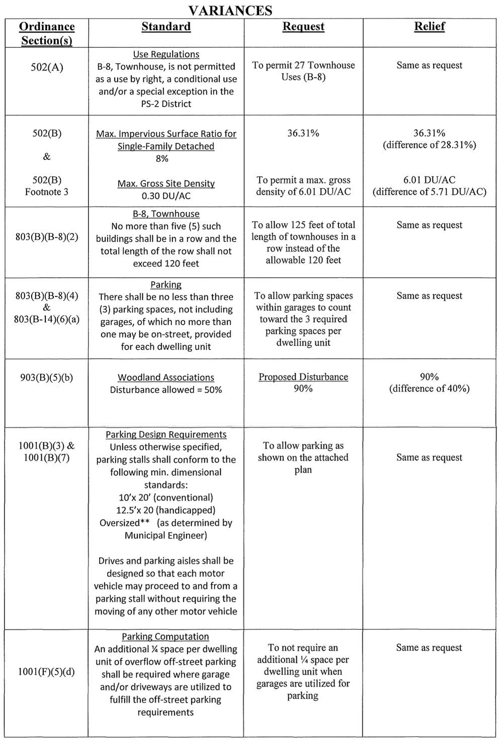 Mr. Dumack responded that the 27 townhouse plan would require 5 or 6 variances from the ZHB [the application actually calls for 7 major variances; see table], whereas sketch plans for 4 single family homes required one less variance. I’m not sure, but I think Mr. Dumack’s argument was spurious, or as some would say, “without merit.”