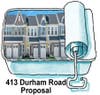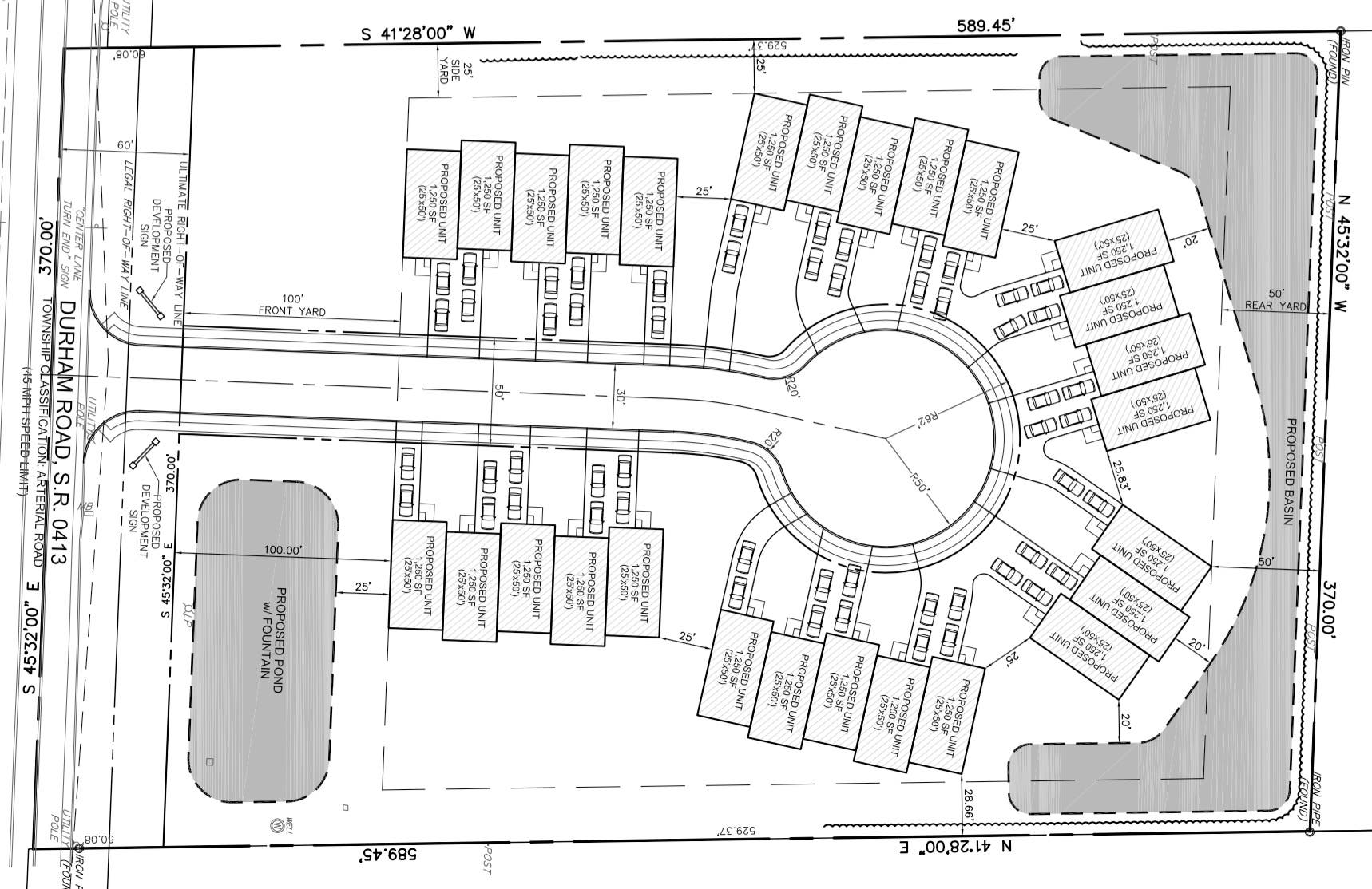 At the November 13, 2019, Newtown Board of Supervisors (BOS) meeting, Durham Partners Group, LLC, submitted a Zoning Hearing Board (ZHB) application for twenty seven townhouses and associated dimensional variances on a 5-acre parcel of land located at 413 Durham Road in the PS-2 (Professional Service) Zoning District. See plan below.