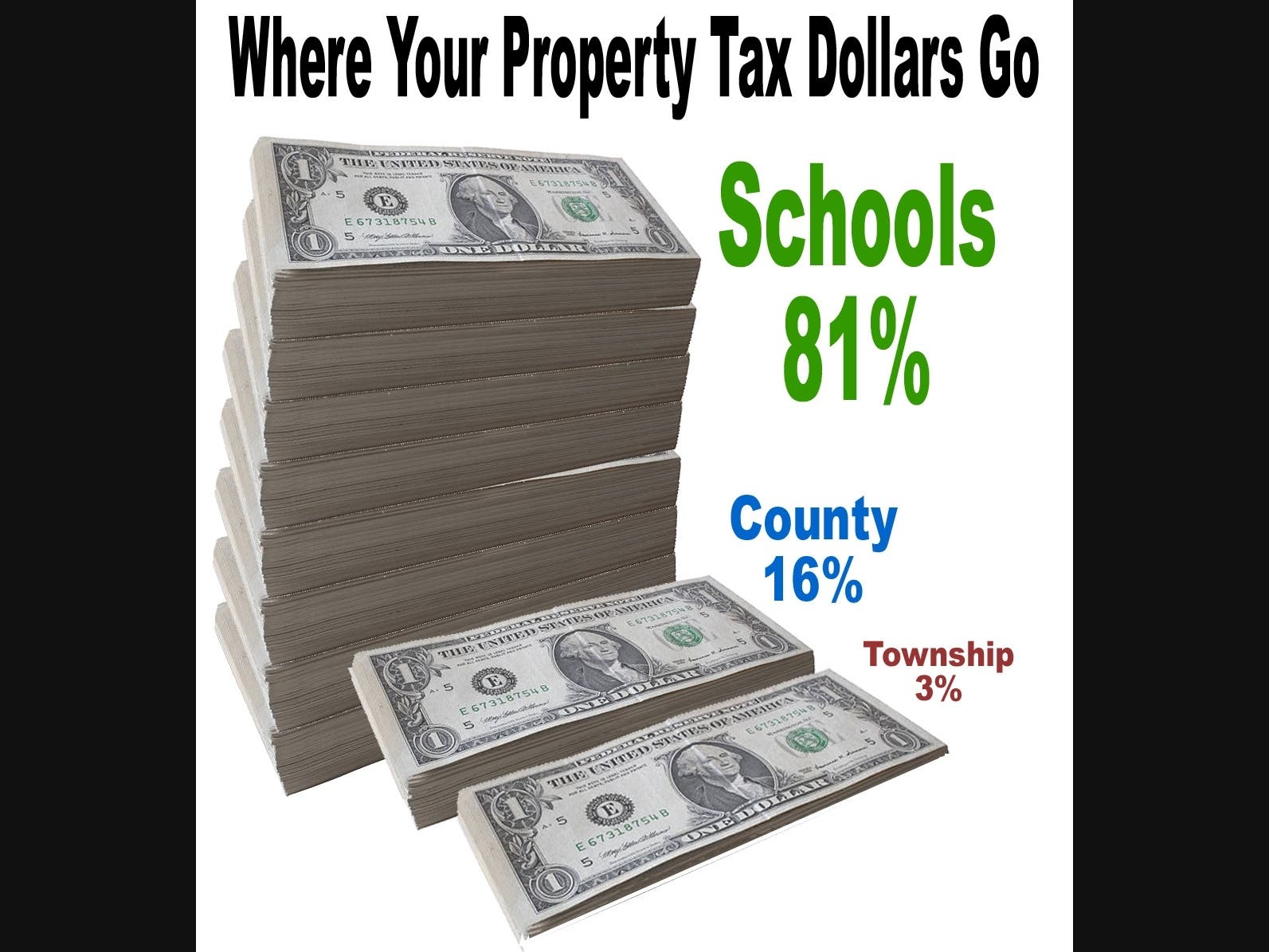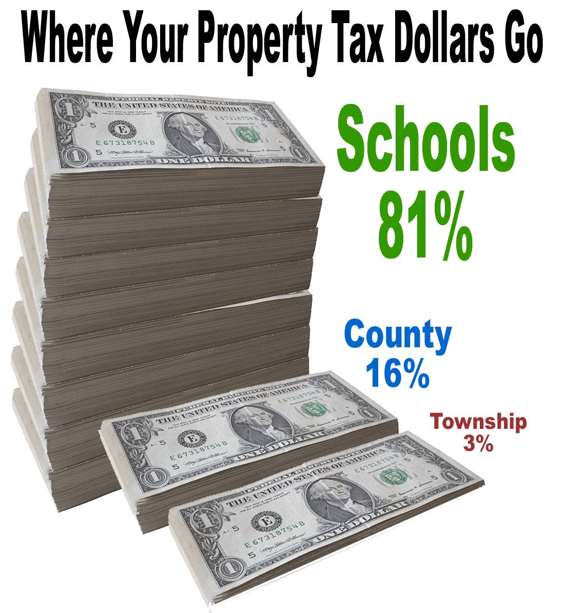 The average Newtown Township homeowner such as myself pays about $4,800 in TOTAL property taxes each year. However, only about 3% of that – about $144 – is levied by Newtown Township. Bucks County gets $802 and the Council Rock School District (CRSD) gets a whopping $3,862! Imagine those numbers as dollars piled up next to each other as in the following diagram.