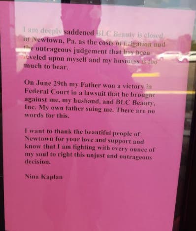 NEWTOWN, PA — BLC Beauty in Newtown has closed. According to a sign posted on the door, the shop closed due to the costs of litigation between the store owner and her father.
