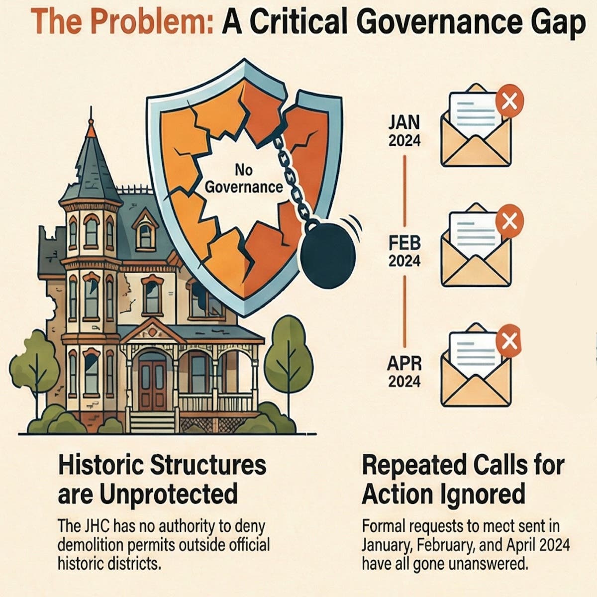 The central problem is a governance gap: the JHC is asked to review demolition applications for historically significant structures that are outside officially designated historic districts. According to the letter, when a property falls outside those protected zones, the commission has “no governance” and cannot prevent demolition.