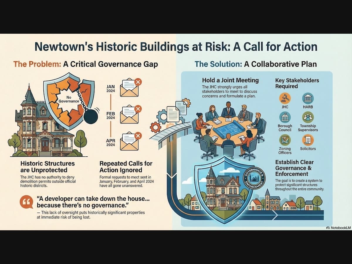 The letter, along with discussion referenced from the 20 January 2026 Newtown Township Planning Commission meeting, describes a years-long struggle between preservation-minded volunteers and municipal processes that, in certain cases, appear to offer review without real authority to act.