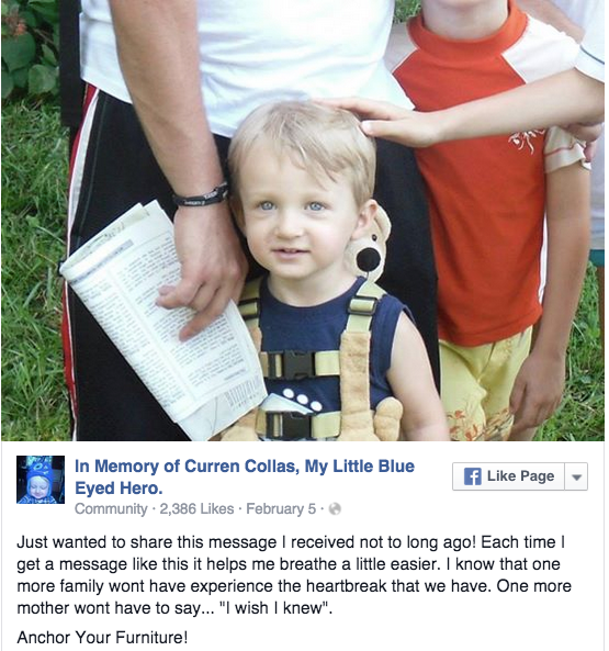 Following the incident, Collas launched a blog, attempting to spread awareness of the importance of anchoring furniture around young children.