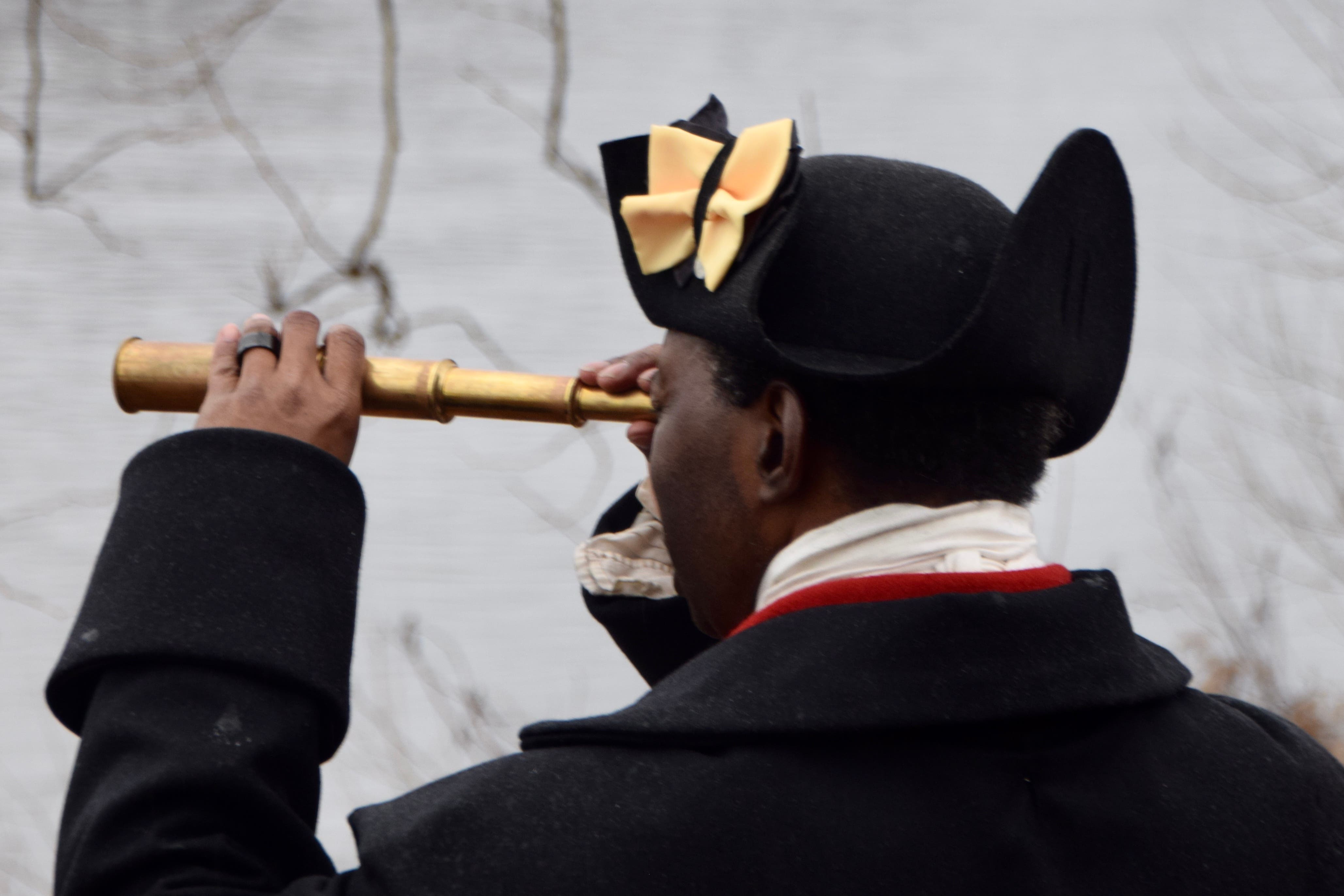 Antoine Watts of The First Rhode Island Regiment keeps an eye out from the New Jersey side of the Delaware River. (Washington Crossing Park Association)
