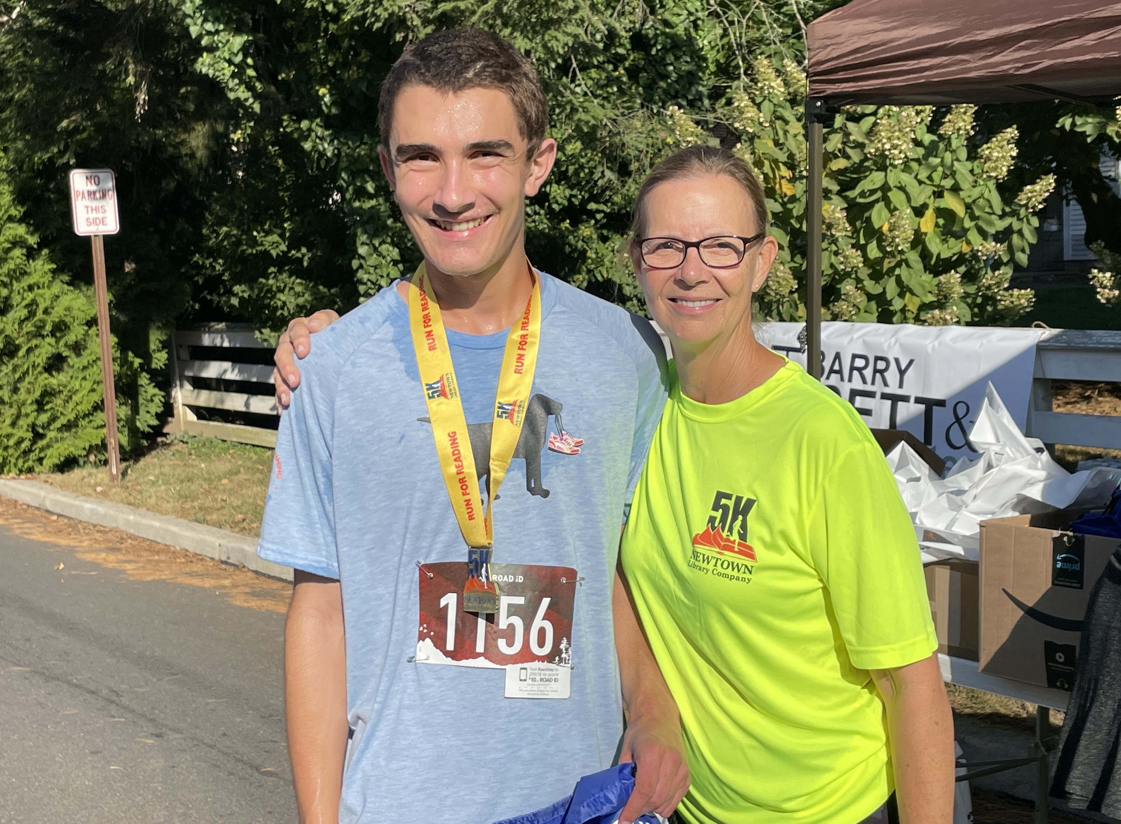 Newtown Library Company Board President Donna Gusty with 14-year-old Liam Steyn of Newtown, the top finisher of the race.
